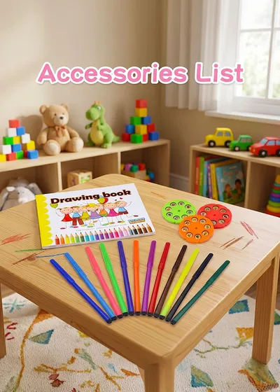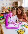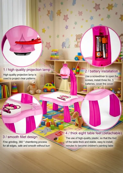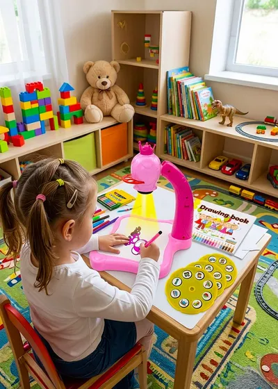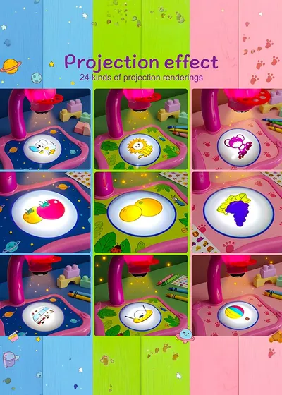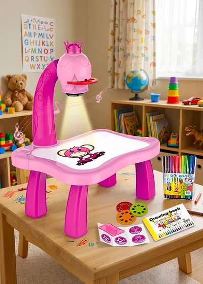 Complete Art Kit: Includes the projector desk, a colorful set of markers, multiple projection discs (with various image options), a dedicated drawing book, and a handy wipe/eraser.