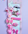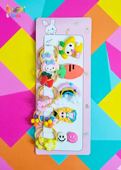 Elastic Ties: Yellow corded elastics with floral and character accents for ponytails or pigtails.