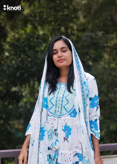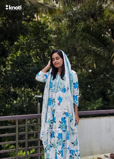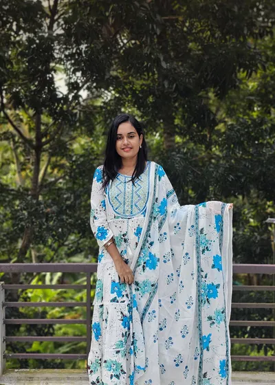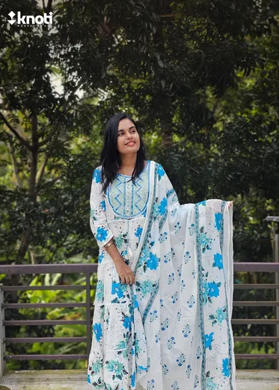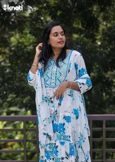 WHITE AND BLUE FLORAL ANARKALI SET OF 3 PIECES