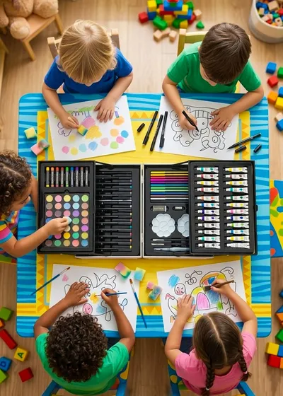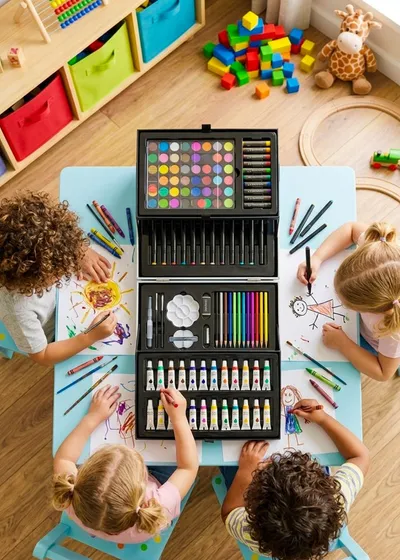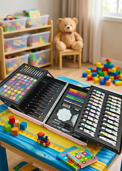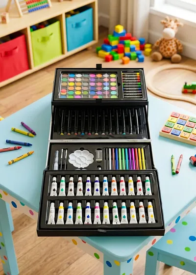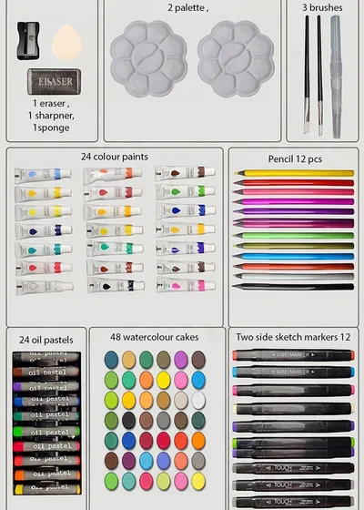The Ultimate All-in-One Kit: Fully loaded with a massive variety of high-quality art supplies, including markers, crayons, watercolor cakes, paint tubes, mixing palettes, brushes, and sketching pencils.